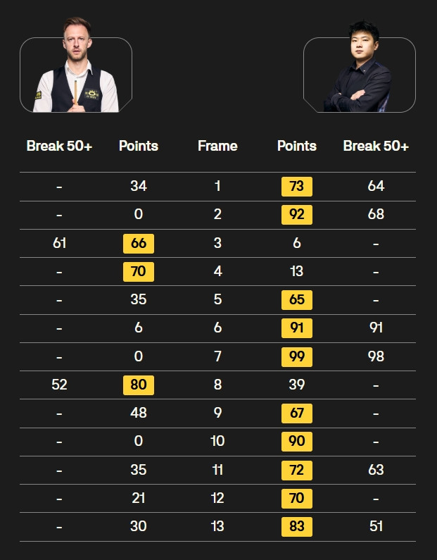 整场对决中,赵心童情景火热,接连轰出五杆50+(64、68、91、98、63);特鲁姆普打出两杆50+(61、52)。