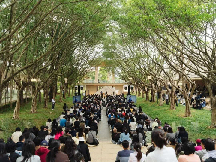 这两天的讲座都在同一个地方举行:一个下沉式的长方形剧场。旁边有一条小河,从后山的九龙湖流下来,一路向北,在港头古村附近注入流溪河,融入珠江水系。剧场里坐满了读者,左边是12棵榕树,右边是13棵榕树,讲台上用大字写着讲座的主题——第一天是“最好的侯孝贤”,第二天是“一生只讲一个故事”。