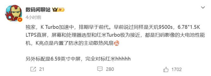 今年中端市场有很多Turbo手机,各家的Turbo都有所不同,红米直接是以Turbo命名,今年增加了一款Turbo max手机,oppo在k系列内增加Turbo手机,近期新机得到爆料,总体定位大致是对标红米Turbo 5系列,标准版采用6.59英寸中屏、高配版采用6.78英寸大屏。