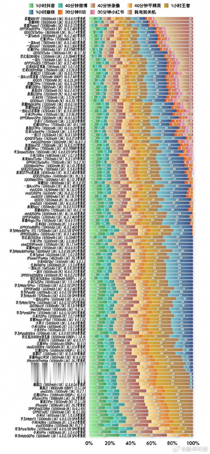 1:2026年1月17日,新评科技正式发布最新手机续航排行榜。该榜单基于真实场景下的多任务耗电测试,对118款主流在售机型进行全面评估。测试项目包括1小时抖音、40分钟微博、40分钟录像、40分钟和平精英、1小时王者、30分钟B站、30分钟小红书等高频使用场景,最终以“耗电到关机”的总时长为排名依据。本次榜单的最大亮点是荣耀品牌表现强势,包揽续航前三名,展现其在电池技术与系统优化上的领先实力。