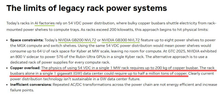 但没人去核实这个数据是否靠谱。分析师们宁可相信英伟达,也不愿自己动手算一算。其实,论文中还写着:“每兆瓦需要200公斤铜”。1吉瓦等于1000兆瓦,也就是200吨,而不是50万吨。