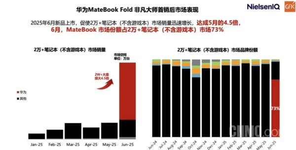 市场数据显示,这款起售价超过两万元的华为鸿蒙折叠电脑受到了高端用户的欢迎。预售阶段,该电脑在华为商城和京东平台的预约量便突破了10万。更为重要的是,根据GFK的市场统计,在上市首月(2025年6月),华为MateBook Fold非凡大师成功促使国内2万元以上高端笔记本(不含游戏本)市场销量环比激增,达到前一个月的4.5倍,其本身更是在该价格段市场中占据了73%的绝对主导份额。