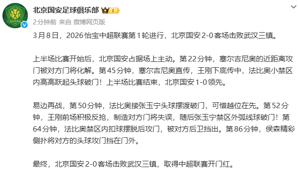 新京报讯据@北京国安足球俱乐部音讯,3月8日,2026怡宝中超联赛第1轮进行,北京国安2-0客场打败武汉三镇。
