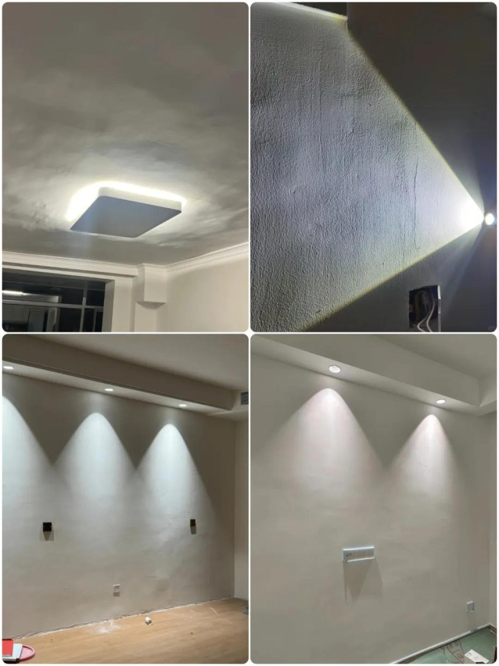 ▲原因:当光线照射时,墙面呈现凹凸不平的现象,一是油漆工的工艺水平较差瞎糊弄,二是偷工减料腻子材料用的少。