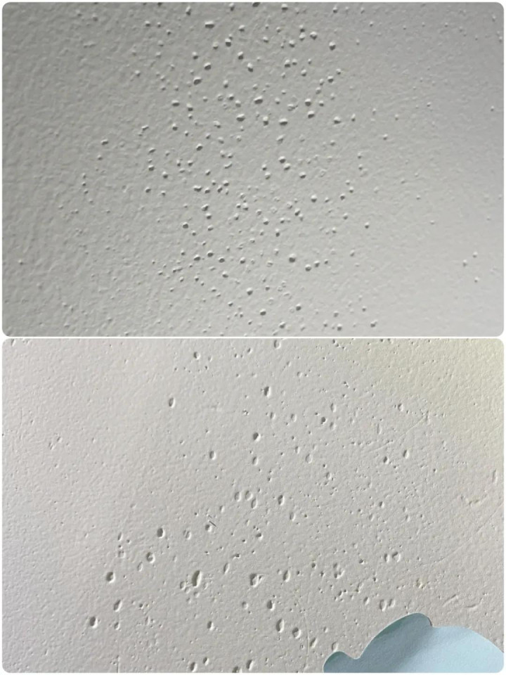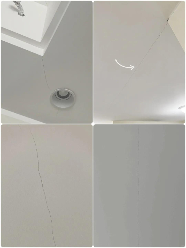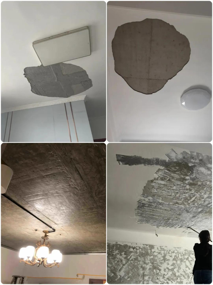 ▲原因:像上图这种顶部大面积腻子脱落的情况,抛开渗水一类这些因素,很大一部分原因是,原开放商顶面的水泥或者白色油漆没有铲除,后期直接在原基础上做,这种情况下掉落一点都不奇怪。