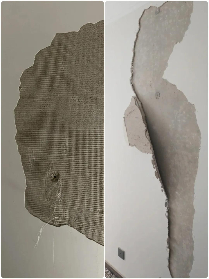▲原因:像上图这样墙面腻子整体脱落,墙面没有漏水返潮的情况下,绝大部分问题是来自开发商偷工减料,原粉刷层水泥少沙子多,附着力肯定不行。