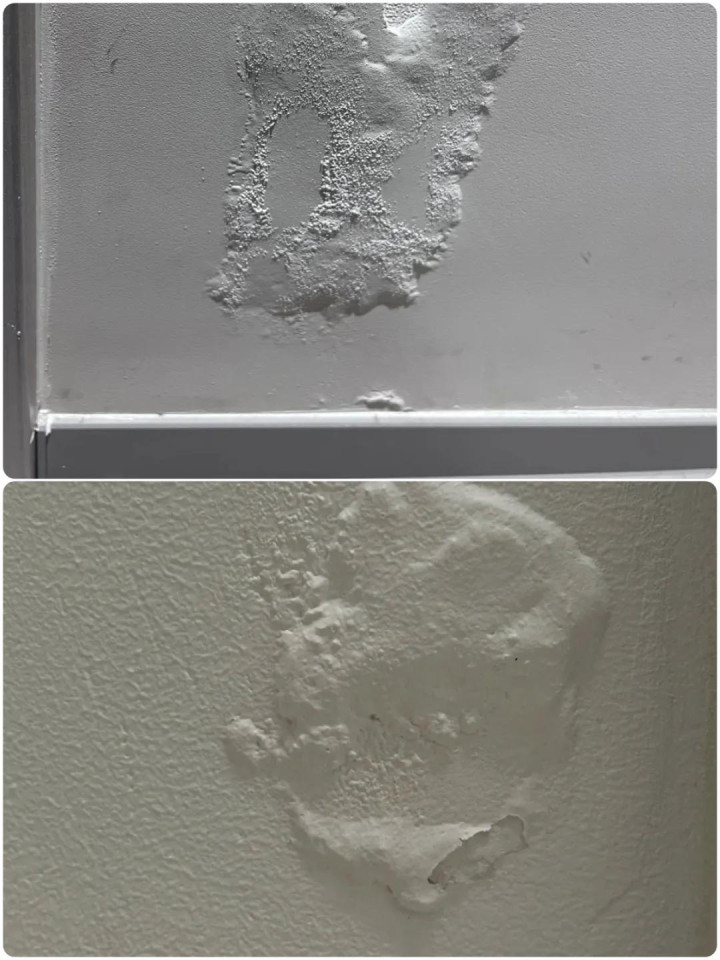▲原因:像上图这样墙面乳胶漆鼓包起皮脱落,里面有白色晶体像盐一样,可判定为基层返潮导致的。
