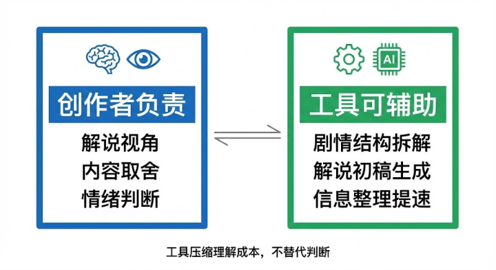 这也是为什么,一些团队化创作者,会通过工具先完成剧情理解和结构拆解,再由人完成最终解说判断。