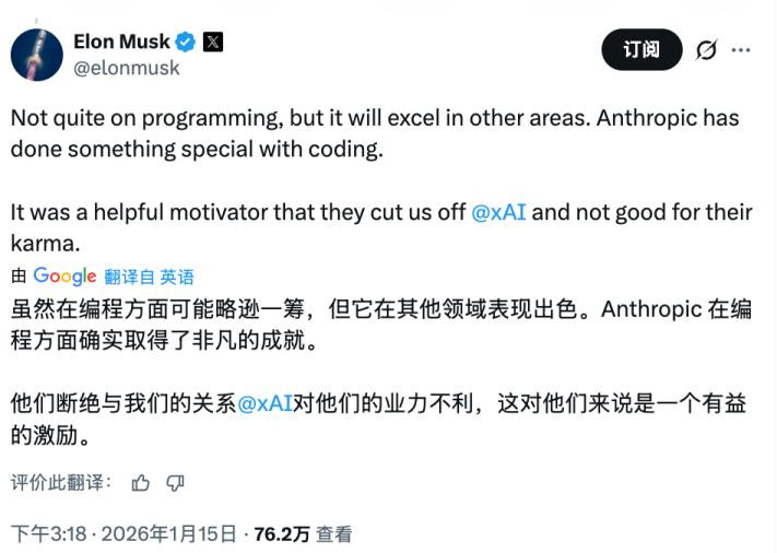 1月,马斯克先是在X上公开承认Grok的编程能力不如Anthropic的Claude。