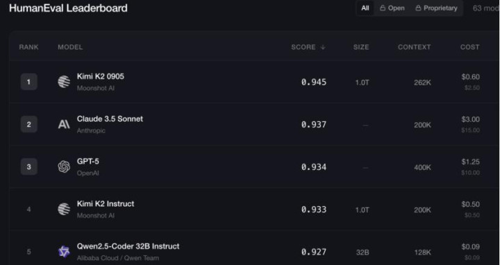 Human Eval排名前五的模型分别来自于Kimi、Anthropic、OpenAI、阿里。