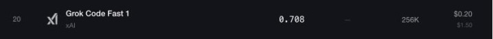 根据llm-stats的最新排行榜,在SWE-Bench Verified中,xAI最出色的模型是Grok Code Fast 1,排在第20位。