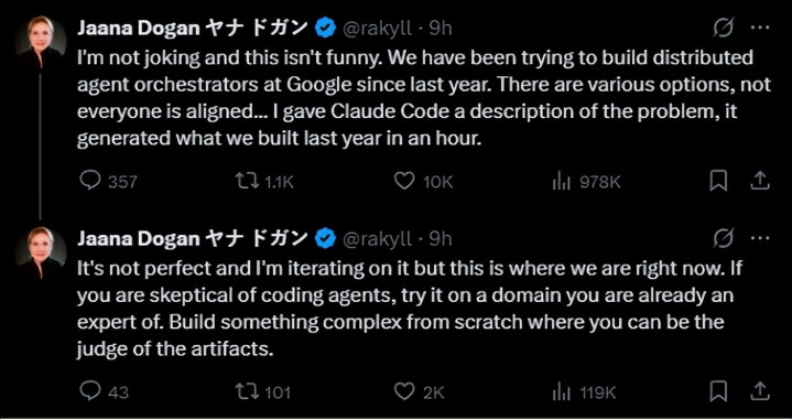 谷歌首席工程师、Gemini API负责人Jaana Dogan公开表示,她只用几句提示词、一个多小时,就借助Claude Code完成了相当于过去一年工作量的成果。