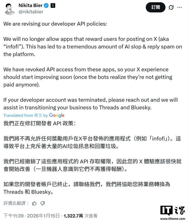 {jz:field.toptypename/}此外,这名产品经理还半开玩笑地表示,如果有开发者因此被封API可以联系X平台,官方可以帮助他们迁移至Threads、Bluesky等友商平台。