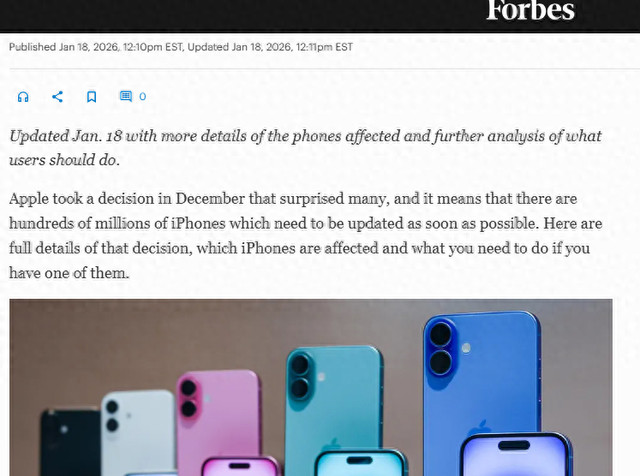 [环球网科技综合报道]据《福布斯》1月19日消息,苹果去年12月的一项决定引发广泛关注,目前全球数亿部iPhone需尽快完成系统升级。据悉,苹果已调整系统更新策略,iOS18系列旧版系统仅对三款机型开放维护,其余机型需升级至iOS26以保障安全。