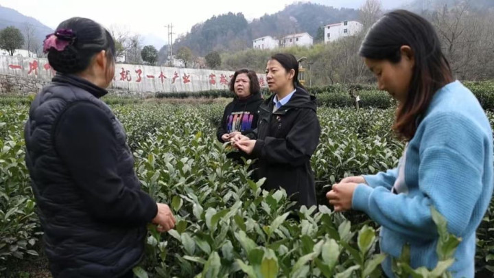 寰球政协委员、安徽省金寨县花石乡大湾村党总支第一秘书余静(右二)在茶园里和茶农们疏通。(受访者供图)