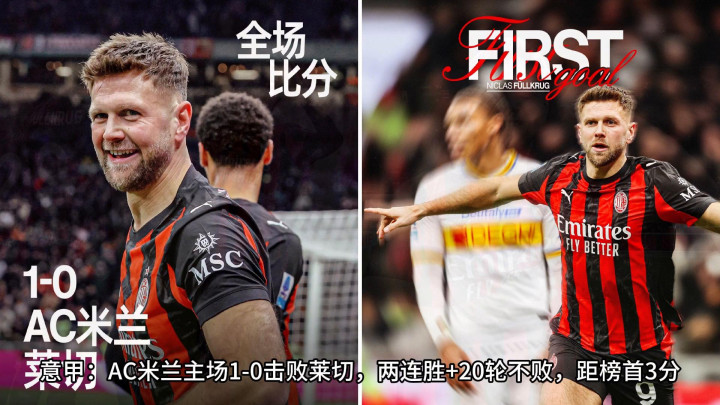 意甲:AC米兰主场1-0击败莱切,两连胜+20轮不败,距榜首3分。莱奥进球因越位被吹,菲尔克鲁格打入米兰生涯处子球。