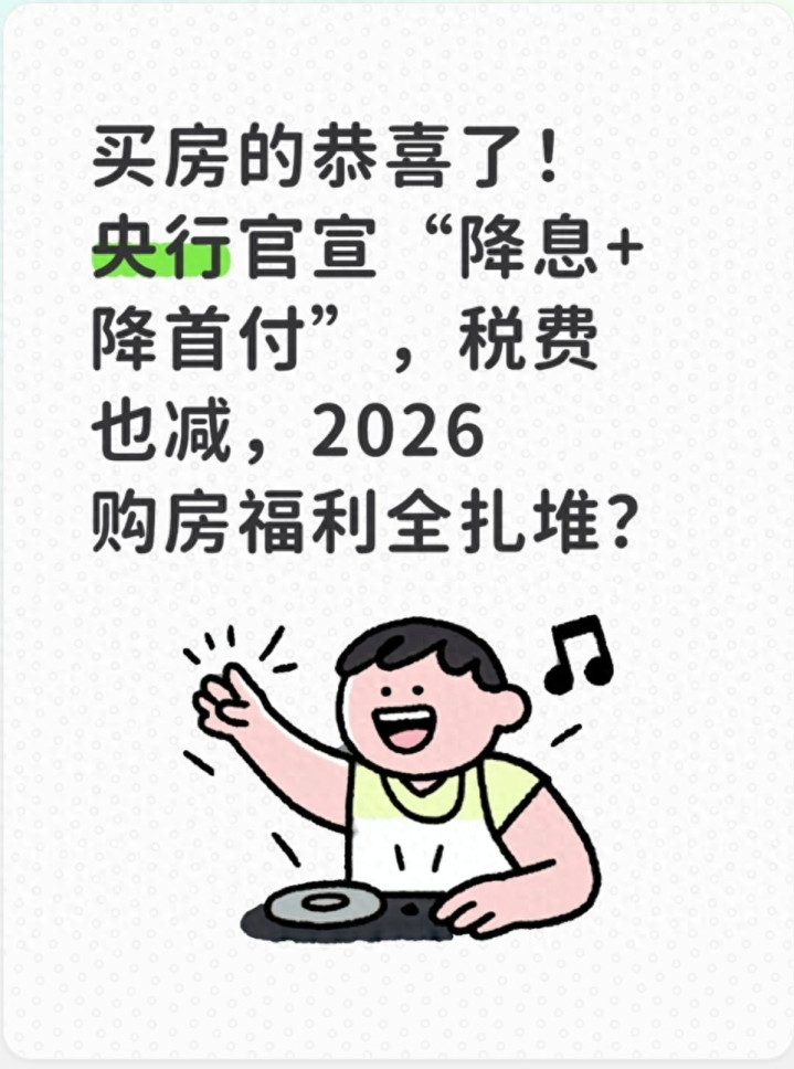 2026年一开年,楼市就迎来了“政策红包雨”!央行接连官宣降息、降首付,财政部还下调了购房税费,不少准备买房的朋友都在问:“这波福利到底有多实在?现在是不是买房的好时机?”作为一直在帮朋友研究购房政策的普通人,我把这些新政扒得明明白白,所有内容都基于官方公告和公开数据,用大白话给大家讲清楚,不管是刚需买房还是改善置换,都能看懂自己能享多少优惠。