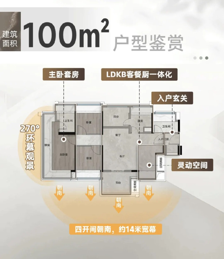 各个户型看到的山景不同,100㎡只有生活阳台可以侧望到,而且只能远远地望过去,山景的体验感肯定是不如其他户型的。