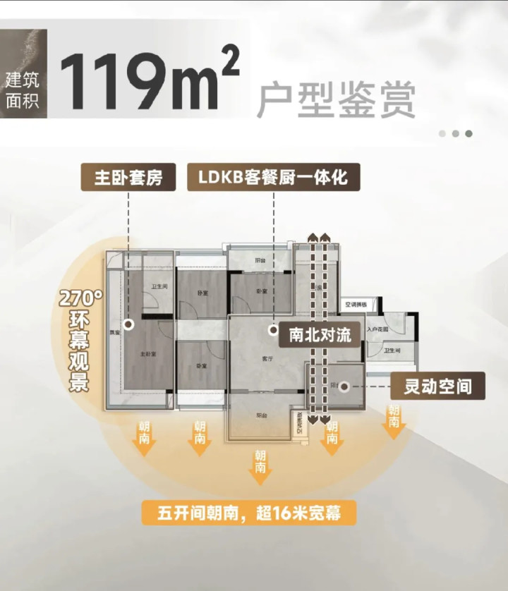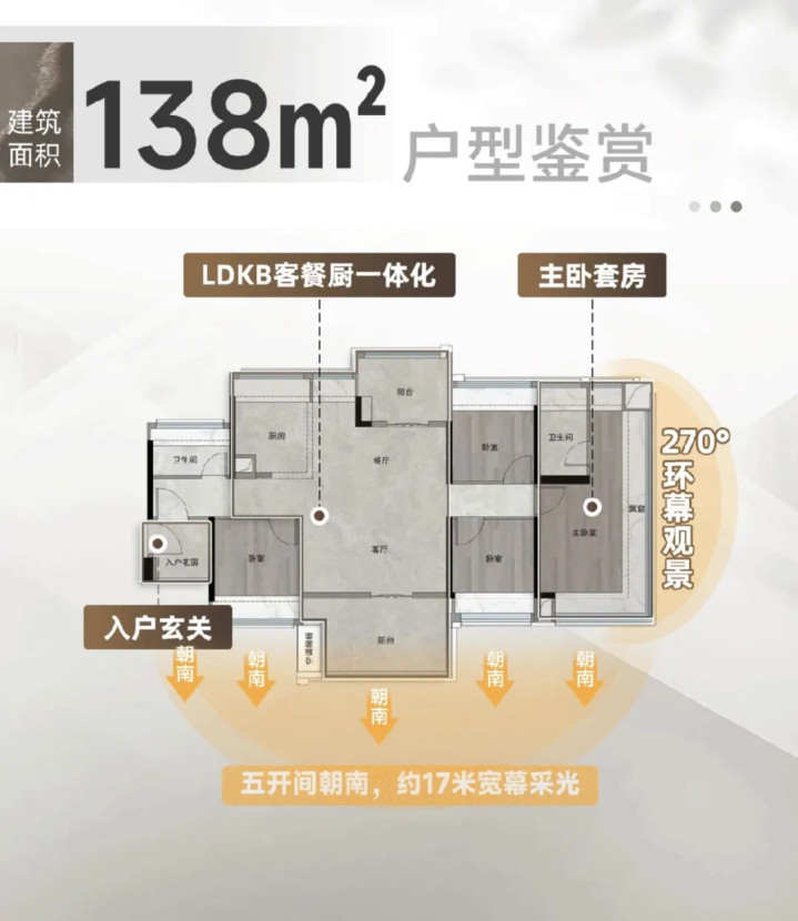 3+1房,四开间朝南。主阳台可以望花园,次阳台可以侧望白云山,南北对流,不足的一点是主卧景观望楼,且靠近路边,次卧2难免会有少许噪音和灰尘。