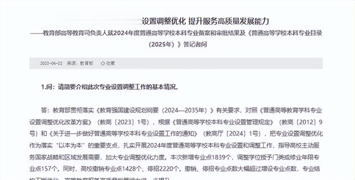西席部2025年更新发布的本科专科目次,把之前的移动成果都纳入进去。新目次里专科类和专科种数有变化,强调服务国度计谋急需。高校根除专科点和停招专科点的总额,在2024年度达到几千个,远超新增数目。早几年比如2021年根除专科点就有几百,到背面每年都在几千的限度上移动。学校上报材料后,西席部备案通过,目次就同步更新。系数经过确保现存在校生以前毕业,不影响他们完成学业。
