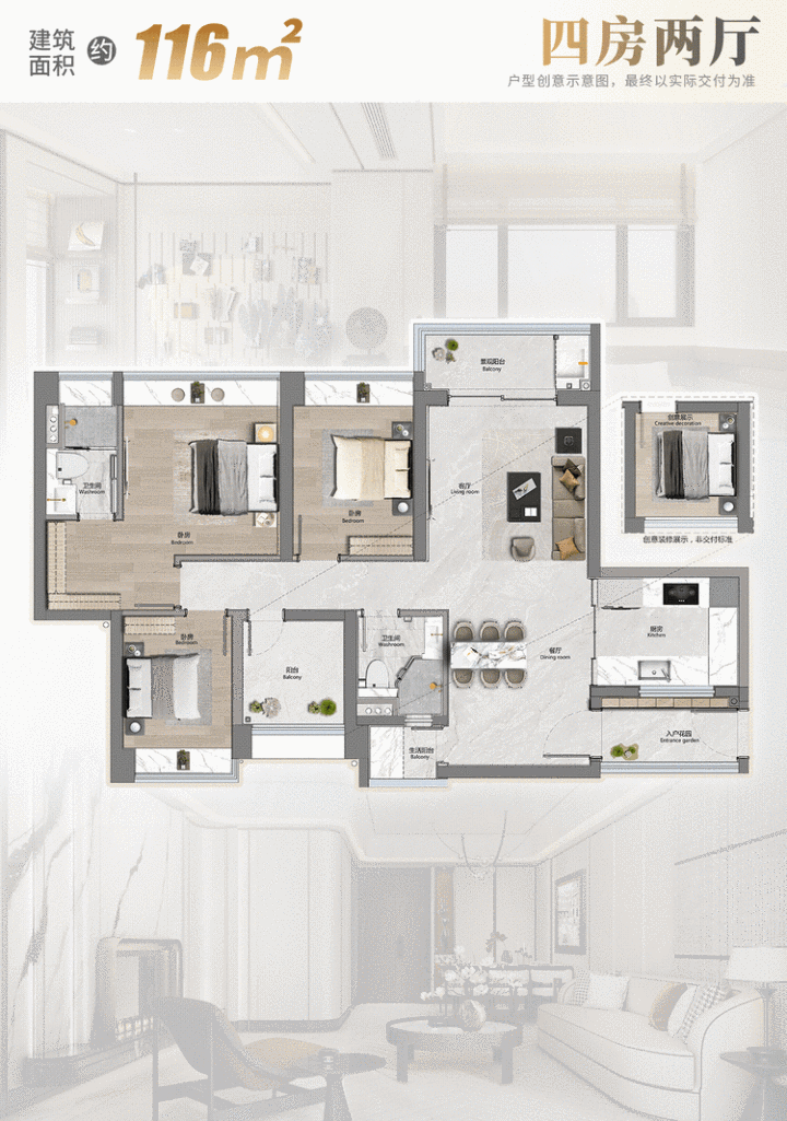 如果说约89㎡三房适配入门级改善,那么建面约116㎡四房,则适合改善晋阶家庭。