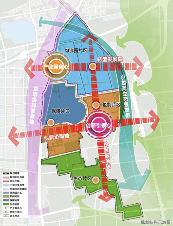 结合大兴区物流园门户节点,打造产业服务心,服务保障物流基地转型开级。依托氢能示范区打造氢能产业创新引领心,引领产业聚集,联动产业发展。
