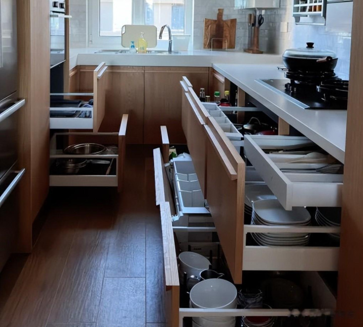 定制橱柜告诉设计师,地柜要多做抽屉,最好最三层设计,实现分类收纳!