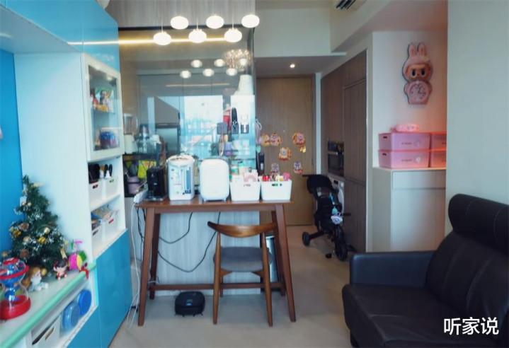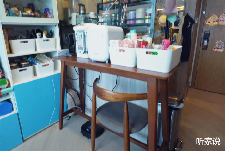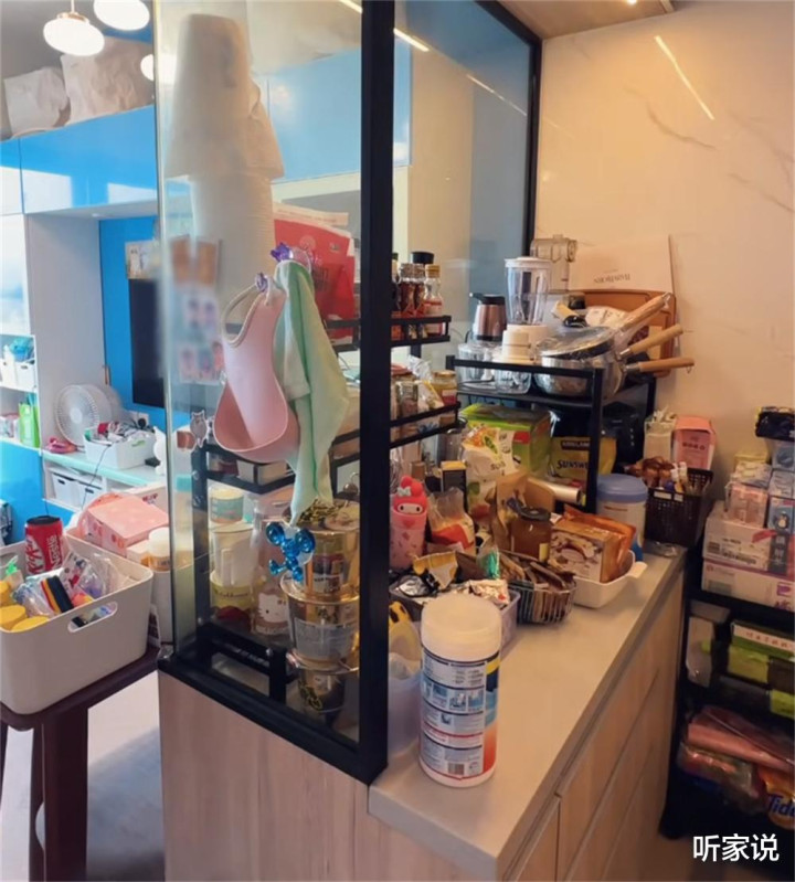 一张小餐桌和一个长条形的吧台,上面堆砌着零食、奶粉罐、泡面和各种各样的生活杂物,最高处甚至已经超过了2米,连从饮水机里接口水喝都要弯腰伸手去够才行。
