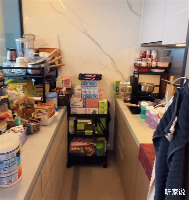 要知道,原本厨房和餐厅间只有一道玻璃,采光还算不错,但这东西堆得过高,已经遮挡住了一半玻璃隔断,让厨房显得昏暗无比。