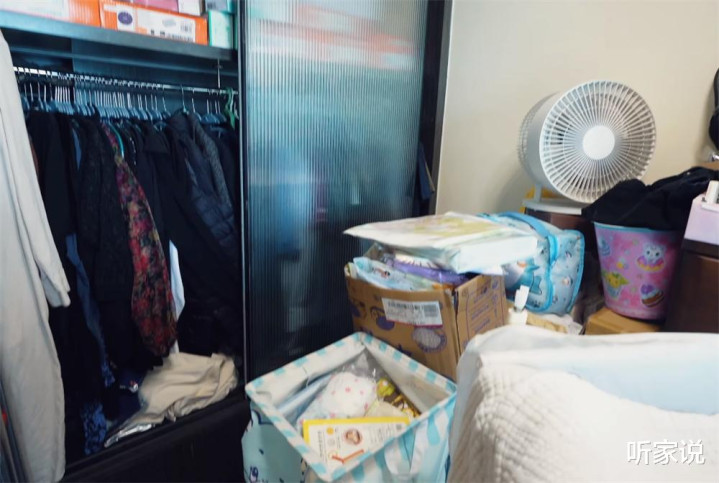 衣柜里的衣服倒是收拾得整整齐齐,奈何只能开一扇门,另一边早已堆了个“天昏地暗”,什么类型的杂物都有,收纳毫无章法。