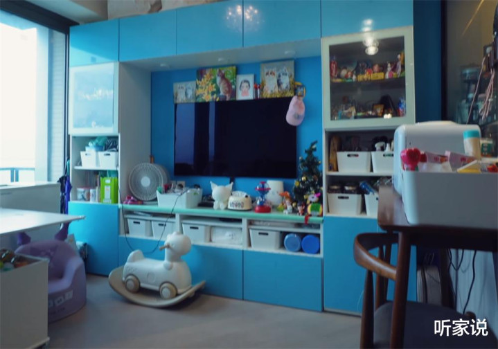 原先那张圆形餐桌被移除,上面的各类杂物都归置在了一旁的电视柜里(没错,多了组柜子,后面会说到),而吧台桌是老两口强行要保留下来的,只好依旧在上面放一些孙女要用到的婴儿用品,总体来说还算整洁。