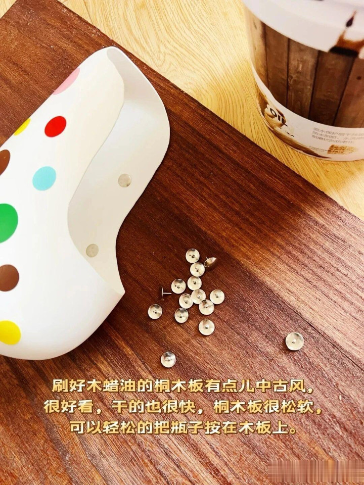 等木板上的木蜡油干了之后,就可以把图钉再按在木板上,这样就能起到固定瓶子的作用了,摆放的顺序可以自己调整,错落有序会更加好看。