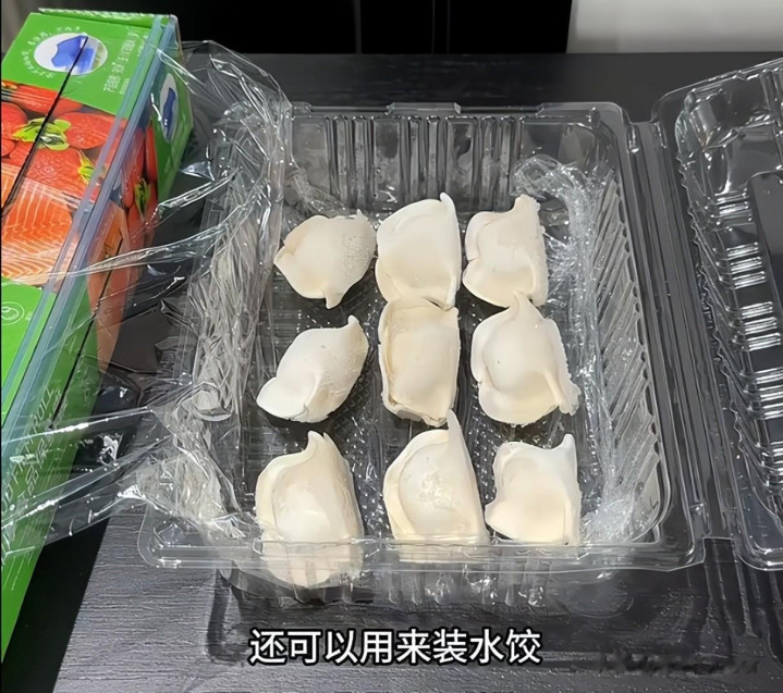 如果是那种比较大的透明水果盒,我们还可以把它铺上保鲜膜,然后来装水饺,再放进冰箱冷冻。