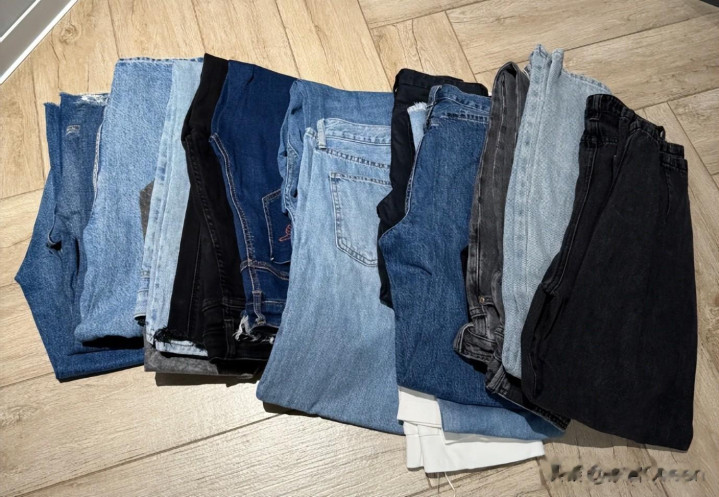 方法也很简单,只需要将裤腿裁剪下来作为底布,然后把其他牛仔裤的裤兜拆卸下来,全都缝在这块底布上。