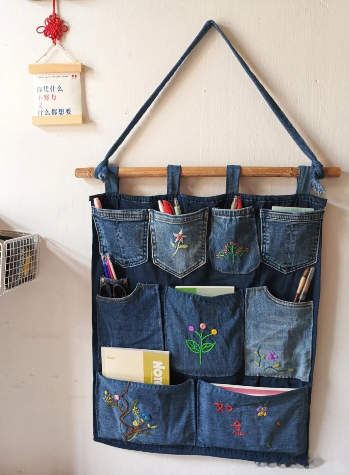 想要实现上墙收纳,除了用空瓶子改造之外,还可以用牛仔裤来实现。每到换季的时候,就会淘汰下来几条牛仔裤,然后稍微改造一下,就能变成上墙的收纳袋。
