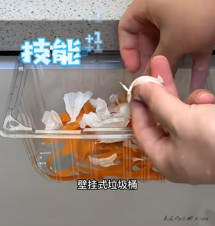 把水果盒的盖子打开之后放进橱柜,推上柜门,你还能得到一个不要钱的垃圾收纳盒,可以平替壁挂式垃圾桶,在削皮的时候或者剥蒜的时候就非常方便了。