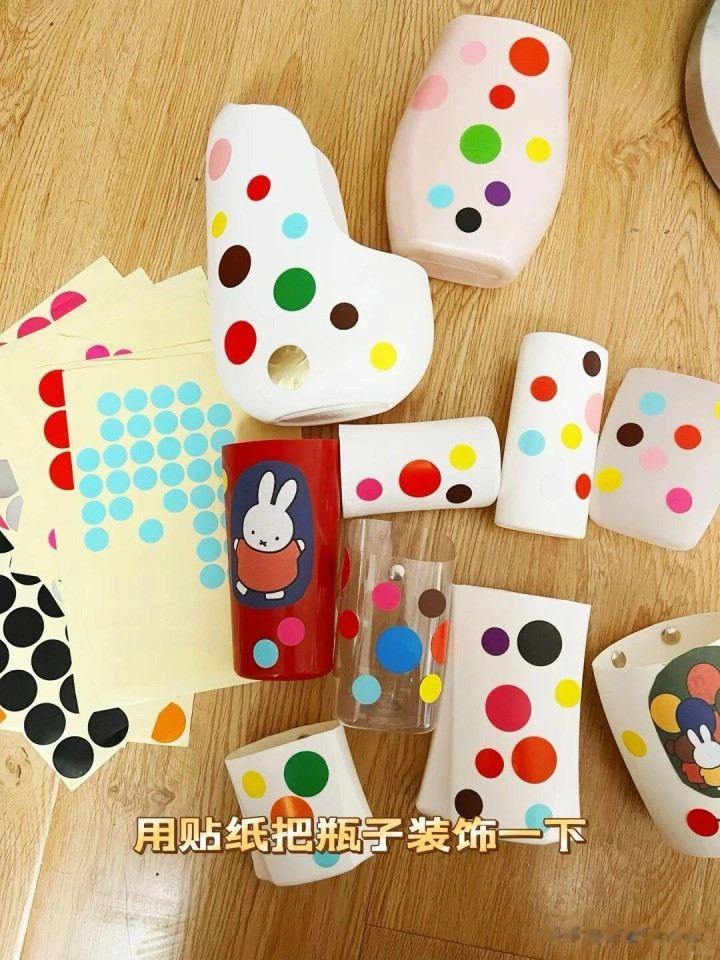 如果家里有好看的贴纸,可以贴在瓶子上做装饰。之后拿出一些图钉,并按在瓶子上。