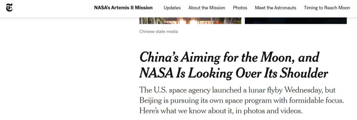 4月3日,《纽约时报》撰文称,好意思国正片面的把中国视为最大的“登月敌手”,其以“中国正对准登月,国度航空航天局(NASA)则在死后警惕”为标题(见下图),指出好意思国正在背后“虎视眈眈”,但愿“抢”在中国之前杀青登月——作为对比,中国科学家告诉《纽约时报》,中国从未将“登月”视为与好意思国“竞争”的缠绵,咱们正在2030年前稳健地杀青中国东说念主数千年来的“登月梦思”。